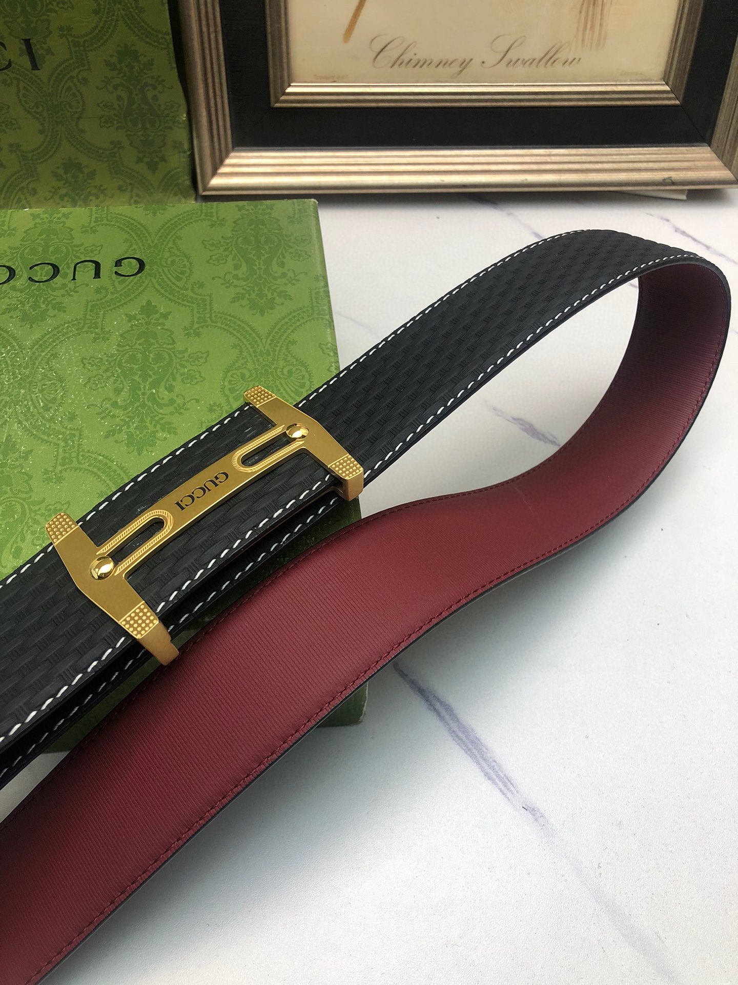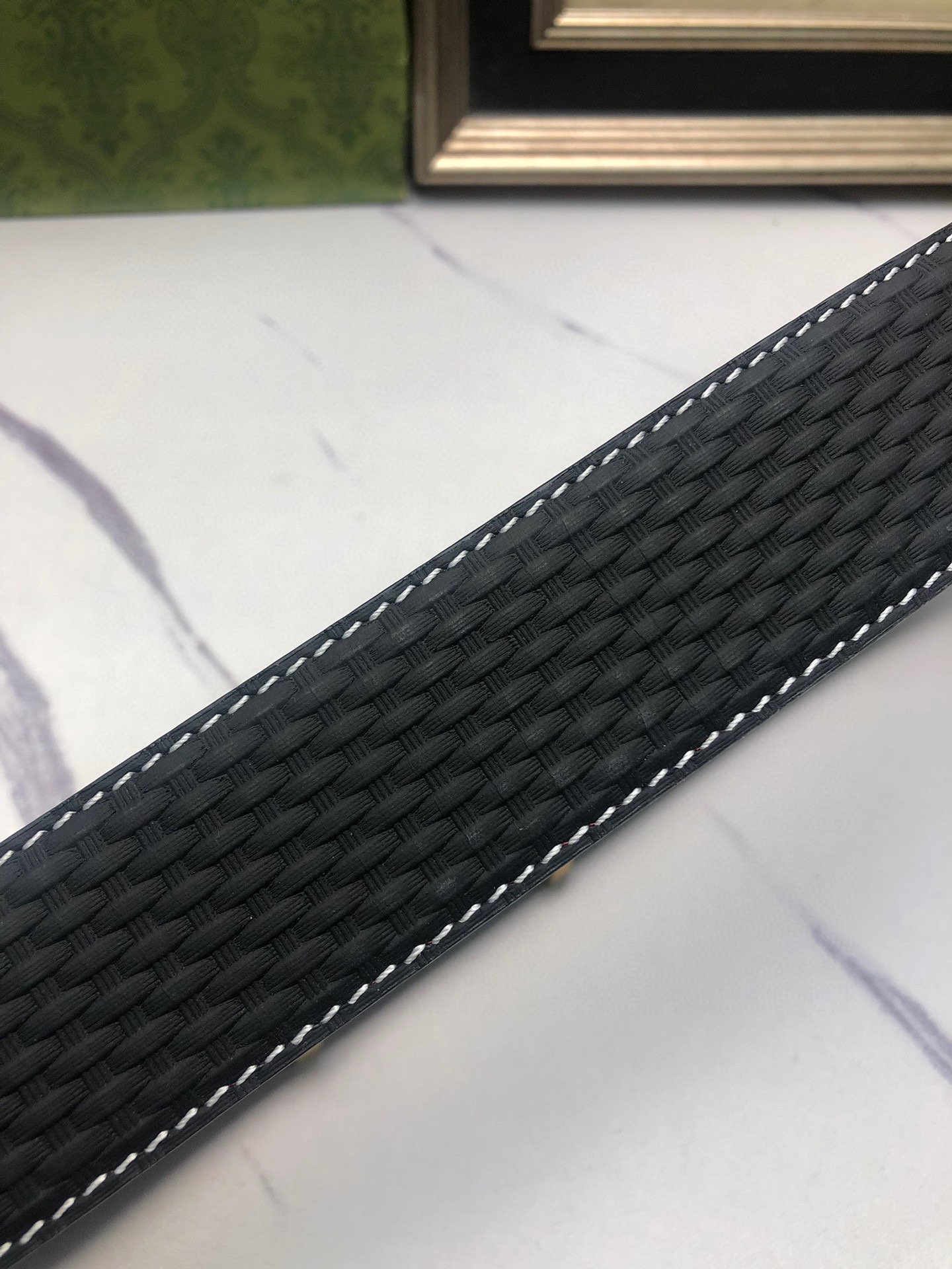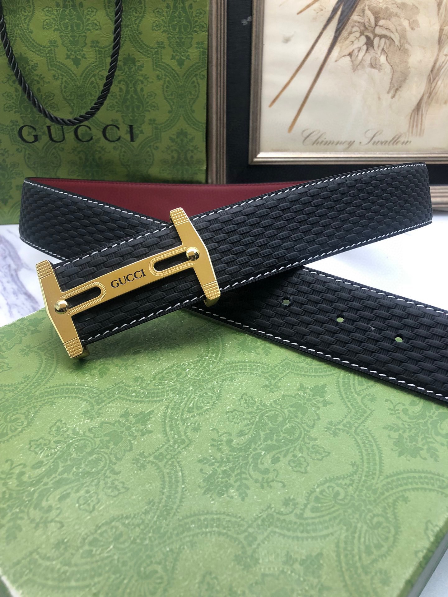 Gucci: Original single-grain calfskin with embossed patterns, lined with plain cowhide base, creating a woven appearance. Decorated with the original single buckle of the logo. The counter width is 4.0