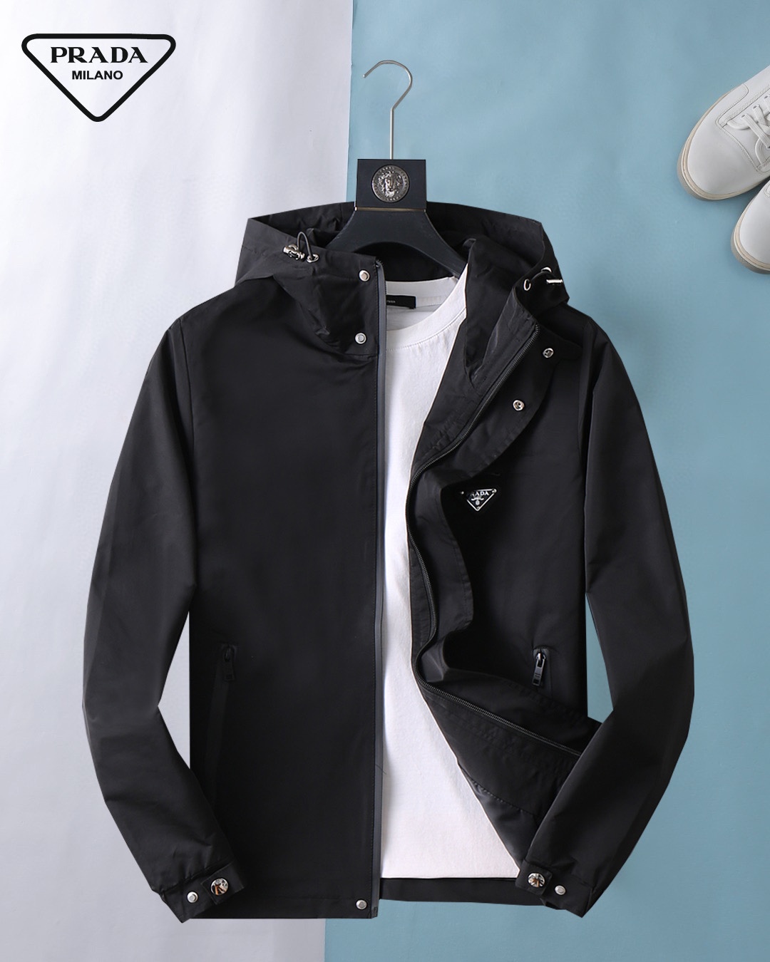 Prada (High-end Quality) Spring 2025 New Fashion Casual hooded Jacket, imported original technological fabric, comfortable and breathable when worn, exquisite handcrafted logo on the chest, unique European fashion style design, digital positioning printing process on the back, highlighting the personality of young people, original hardware accessories, extremely high grade, looking very cool when worn! Please report your height and weight when placing an order for M-3XL!